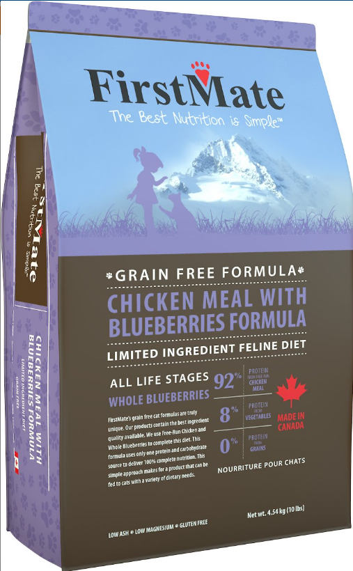 FirstMate’s Chicken Meal with Blueberries cat diet is a wonderful choice for kittens or cats at all stages of life. Free Run Chicken provides a single source meat protein. This simple, limited ingredient diet allows for easy digestion and a reduced chance of allergic reaction. FirstMate’s grain and gluten free cat diets are loaded with fresh blueberries which provide a nutritional source of antioxidants. Blueberries promote a healthy immune system, urinary tract, increase eyesight and memory function, and provide a source of dietary fiber. All FirstMate formulations are manufactured at their family owned facility located in Chilliwack, B.C., Canada, with care.